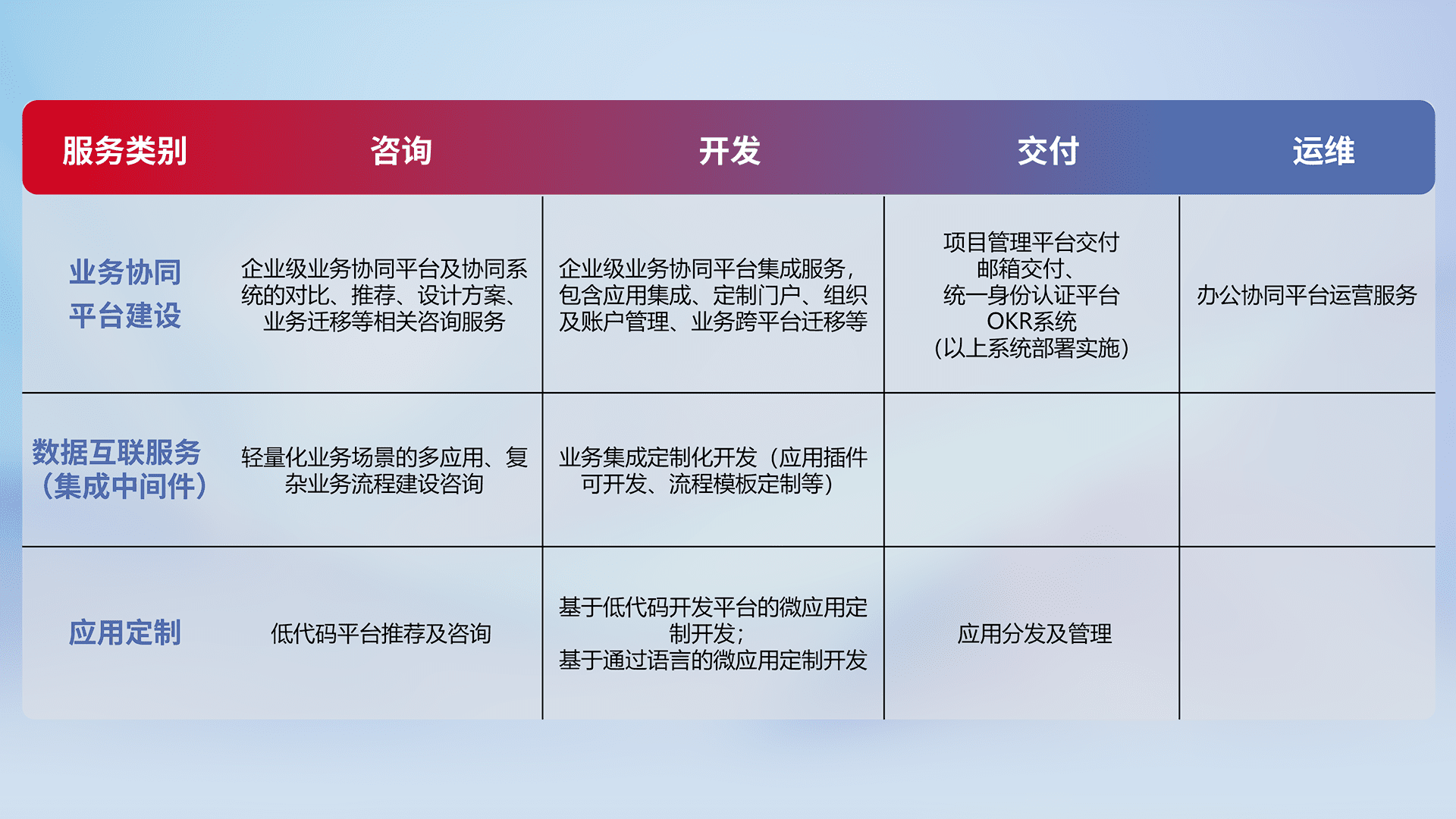 针对钉钉、、、企微、、、、IDaas等平台级产品提供产品的规划、、、方案、、、、交付、、、定制化开发等服务,,实现如统一协同办公、、、智能客户服务、、、混合会议管理、、、智能数据查询、、、等业务场景,,实现数字化转型。。。。