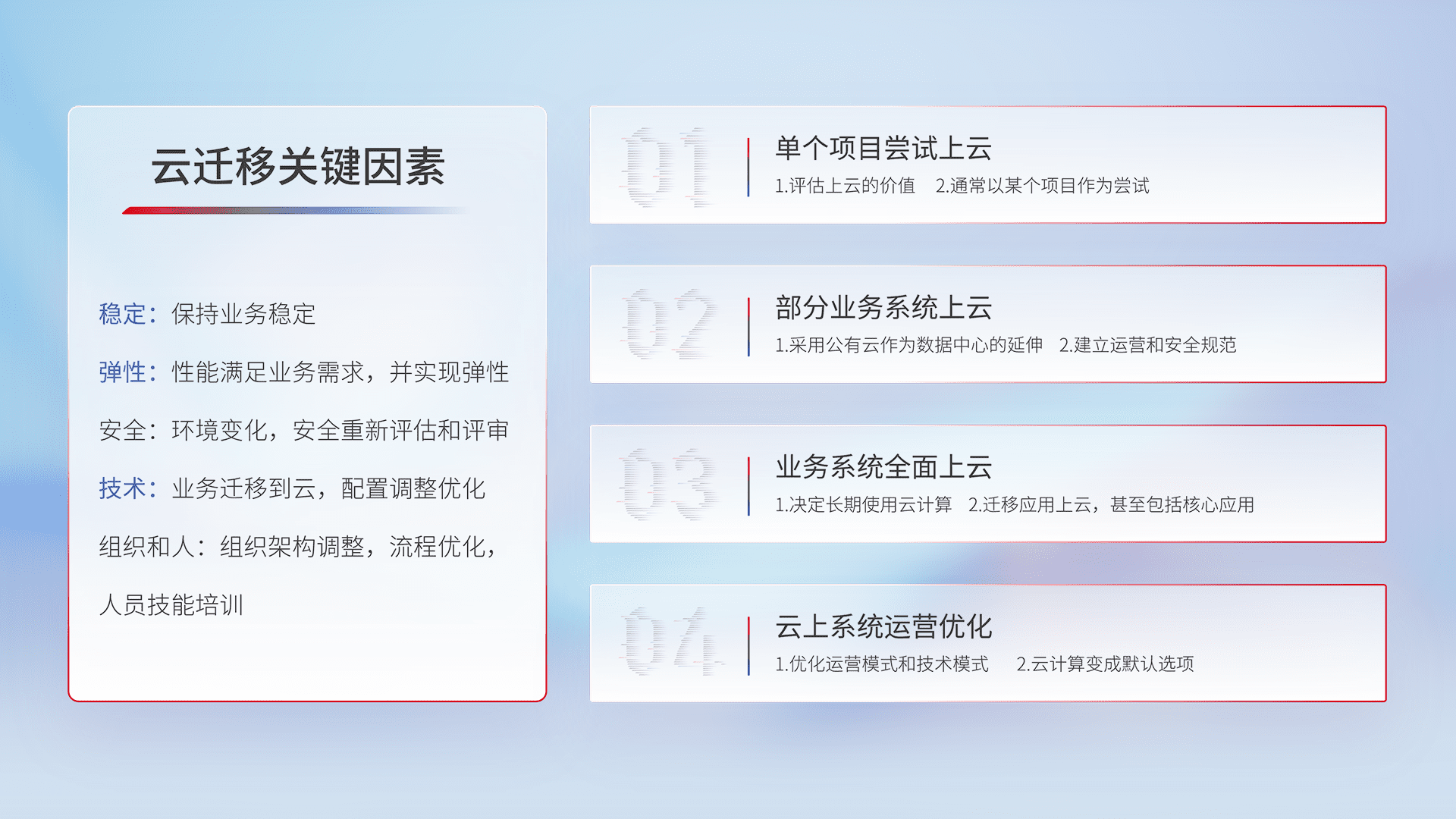 结合实际业务,,从规划设计、、、云平台选型、、、、云原生改造、、数据迁移、、集成交付,,,迁移全过程为客户识别最佳上云路径,,,,做好风险识别管理,,,,设计网络架构、、、、身份权限、、、、安全审计合规、、、操作审计、、日志审计、、、监控告警策略、、多站点容灾设计等,,对云上基础设施进行整体规划,,提升IT治理水平,,,以满足弹性、、高可用、、高性能的需求。。。