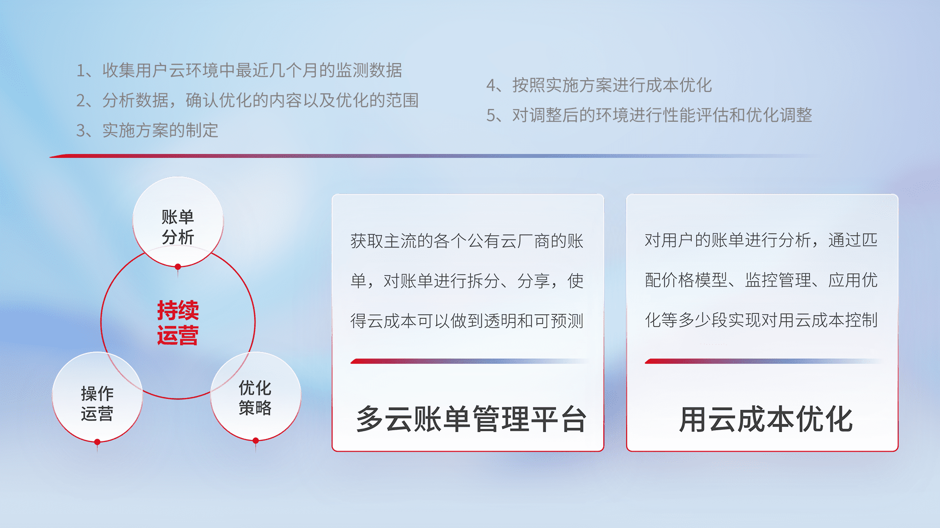通过多云纳管,,以统一的资源数据模型把客户的云资源进行抽象和封装,,,,进而实现对多云资源的统一操作,,,,保障云资源管理的可靠性、、、稳定性与可用性。。。量身定制化运维内容,,配置、、、开发运维、、、、补丁管理、、、备份、、、、监控、、认证和访问管理、、、审计和日常巡检等,,,保障在用云过程中的可靠度,,稳定度以及高可用率。。。。