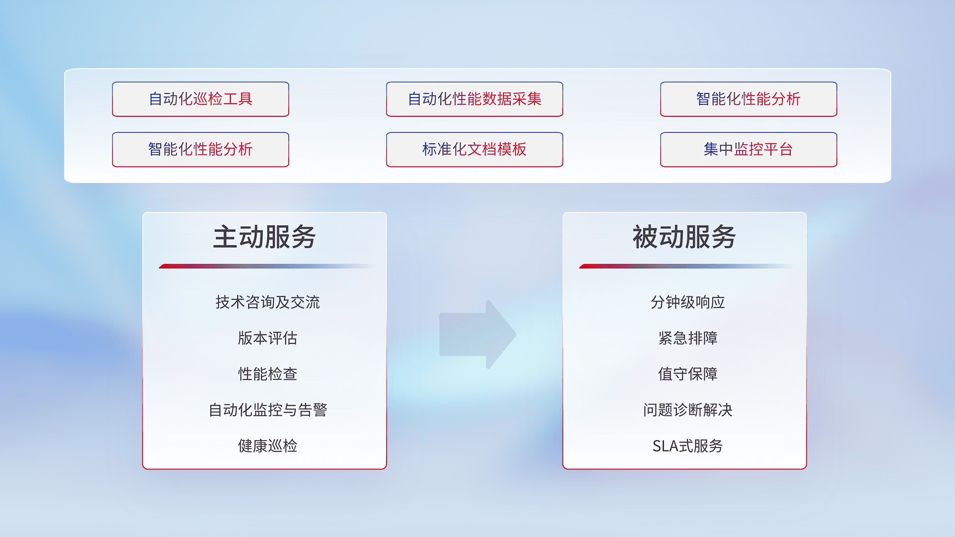 智能化工具和标准化文档,,,保障服务质量,,提供主动服务(包含技术咨询、、、、版本评估、、、性能检查、、、自动化监控与告警、、、健康巡检)和被动服务包含(分钟级响应、、、紧急排障、、值守保障、、、问题诊断解决、、、SLA服务)。。。